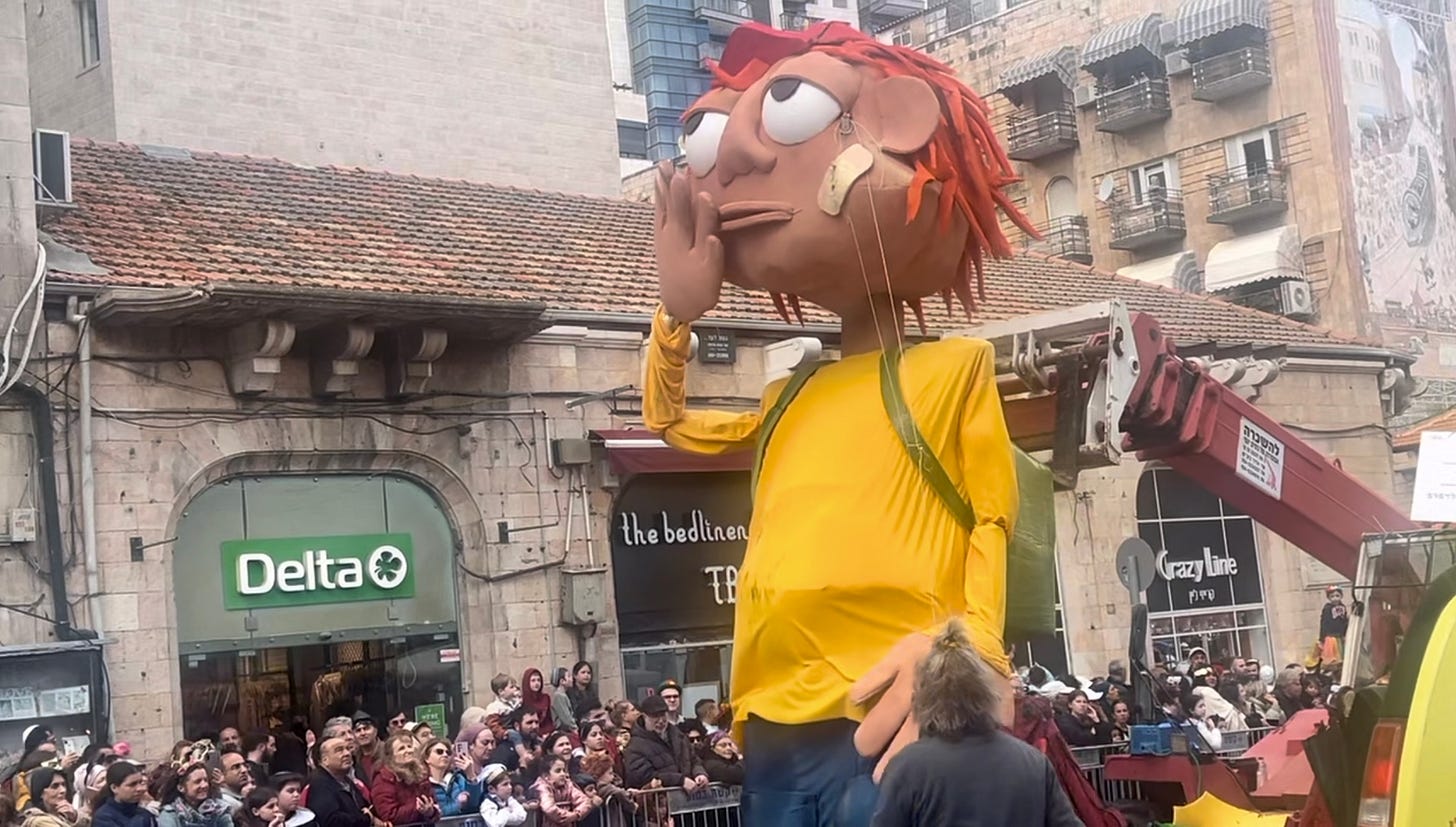 The train was also packed with princesses and superheroes. I asked someone to move their bag and sat next to a religious guy who was in the middle of an argument with a big guy from Haifa. They were shouting about politics and religion. After five minutes of them haranguing each other, other passengers admonished them to stop discussing politics. It was a festival, they remonstrated. The two bickerers begrudgingly sheathed their words back into the scabbards of their throats and shot silent daggers from their eyes. Their gefrunzled glances then roamed the carriage, searching for a sympathetic look of approval from a stranger who might adjudicate one of them the winner. Their eyes both settled on me. I didn’t even understand the Hebrew they’d been arguing. The train remained stationary on the platform and a French lady with her children began speaking in English to the strangers around her. She said her girl was learning Hebrew in an ulpan. They didn’t want to live in France anymore because of the situation. An old man with one arm said words of welcome to them. His prosthetic limb was harnessed at his shoulder and he had a hook for a hand. A small child dressed as a pirate looked up at him through the nook of his mother’s elbow. The French lady continued. She said she felt like they had to hide their Jewishness in France and she didn’t want her children to grow up like that. She said she wanted to live in Tel Aviv. Cliched jokes about the cost of living in Tel Aviv ensued. This small, banal ceasefire had been enough for the bickerers to tolerate and they started up again. They felt relief at not having to contain their words anymore and continued their dispute where they’d left off. No more talk of a chag from the other passengers, things had been loosened up enough in the carriage for others to join in. The man with one arm spoke angrily against the religious exemption from military service, waving his hook in the air as the child dressed as a pirate observed it gliding like a seagull. The one armed man spoke his words directly to the religious guy in Hebrew, but would then translate his speech in English to the French lady, trying to win her over and be her trusted guide in the chaos of Israeli society. The religious guy thumped his book with sun baked face and wild eyes that indignantly refused to yield any ground, his voice feeling entitled to fill the whole carriage with no inhibition. The train engine finally started and we were off. As the train left the station we emerged out into the hills of Jerusalem. The man with one arm pivoted from the argument to wax lyrical to the French lady about the trees and the greenery. “You don’t have this in Tel Aviv” he said. The French lady said it’s good to be able to argue but not to fight. The religious guy was now back at his book reading and singing to himself. The guy from Haifa was on his phone. I looked out the window at the rocks and brush on the terraced hills. There was the smell of someone eating chips on the train and I thought of the English seaside. The chips in Israel were good but occasionally I missed the fat proper chip shop chips and salt and vinegar. As we clicked along the religious guy turned to me and said “Why did we leave Mitzrayim? Why did we leave Mitzrayim?” He repeated it over and over to me. It was unclear if he was asking a question or expressing regret that we’d left Egypt. I mumbled some answer, knowing it was going to be a trick question. But my mumbled answer got lost as the three way argument started up again between the religious guy, the man from Haifa, and the dude with one arm. The religious guy got super animated and spoke across my face to the man with one arm sat across the aisle. Everyone was arguing in front of the French lady who seemed to be enjoying it and smiling at her children. Noise and spittle crossed back and forth across my face like cannonballs. “Oy v’voy” said the religious guy. “Oy v’voy” into my sore ear. I started to grow annoyed, trapped between this conflict. I felt myself wanting to remain aloof and focus on my journey, but gravity was dragging me into the chasm between the two sides. The child dressed as a pirate watched the one armed man quoting statistics about birth rates and demographics in Hebrew and then in English. The religious guy prodded his finger against letters in his open book. And then no word of a lie, something happened that I’ve never experienced before on the train. The carriage started jerking violently. It felt like a plane experiencing turbulence up in the sky. As they argued the train jerked left and right. It genuinely felt like it could derail. It actually made me anxious - half expecting a crash. I’d never experienced such precarious wobbling on a train before. As they argued and the train jerked, the guy from Haifa typed something into his phone and showed it to me. It was google translate. “My friend lost his hand fighting in 1973 and this is how he speaks to him.” The religious guy looked at the phone and then defiantly raised his own hand to show a severed thumb. I don’t know if an explanation was given for the absence of his thumb, but they continued to bicker as the carriage wobbled left and right. The train somehow managed to keep hurtling forward and I got to Haganah in the end - but it unnerved me the whole journey. I’m not scared of any Haman. I’m scared of what we can do to ourselves. I know there’s an answer for why we left Mitzrayim. But it can’t be to split like the Red Sea.